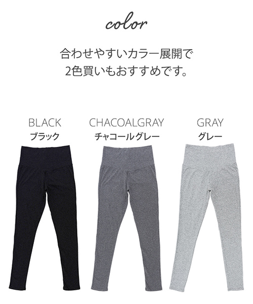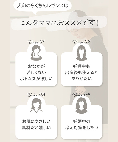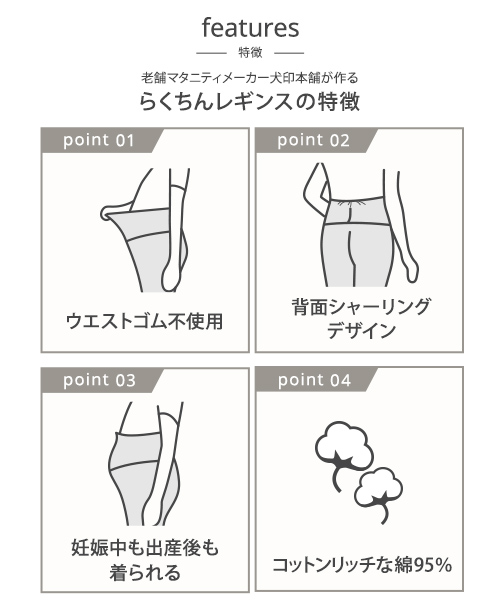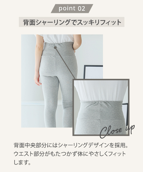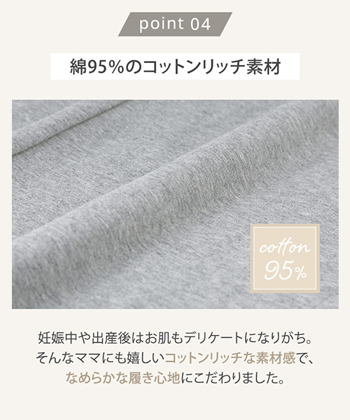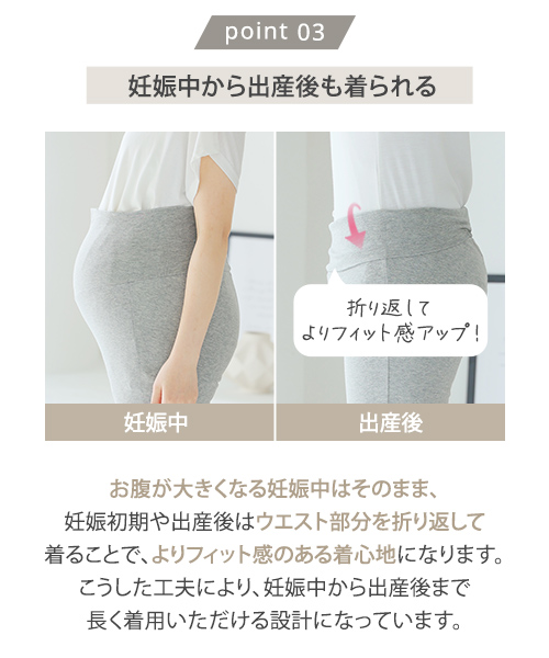 ・伸縮性の高いコットンリッチなマタニティレギンスは、はき心地抜群! ・幅広のウエスト部分が変化するお腹にやさしくフィットするので、締め付ける事なくらくに穿いていただけます。 ・ウエスト部分を折り返せば妊娠初期、産後も着用いただけます。 |