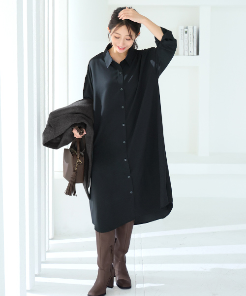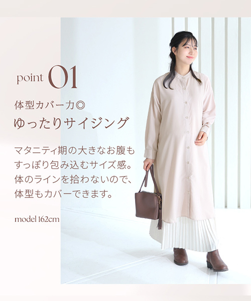 2248503 犬印本舗 マタニティ ワンピース シャツワンピース マタニティワンピース 長袖 きれいめ オフィス おしゃれ カジュアル オフィスカジュアル 仕事 仕事用 会社 職場 通勤 ビジネス シャツワンピ シャツ コーデ シンプル 無地 上品 M L サイズ 大きめ 襟付き マオ襟 シャツ襟 マオカラー スタンドカラー ロング 丈長め 膝丈 レディース 黒 ブラック ベージュ ワンピ 前開き 羽織り 妊娠 妊婦 臨月 授乳 妊婦服 産後 産前産後 INUJIRUSHI 犬印
