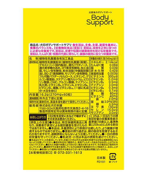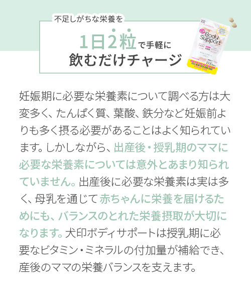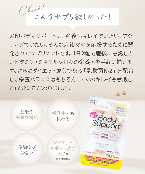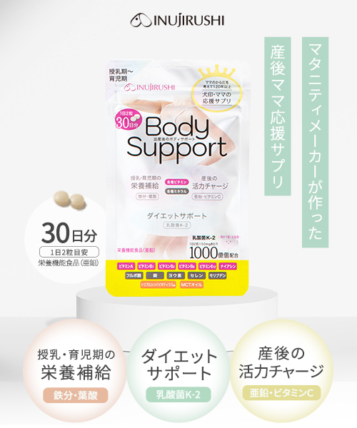 関連ワード ※商品説明するものではありません。※ FD101 犬印本舗 ボディサポートサプリ 産後 授乳 育児 ママ 栄養補給 ボディメイク ダイエットサポート 乳酸菌K-2 産後ダイエット ダイエット ダイエットサプリ 授乳中 飲める 栄養機能食品 亜鉛 葉酸 鉄分 ビタミン ミネラル 乳酸菌 便秘 腸活BG21菌発酵物粉末 フルボ酸 トリプルシンバイオティクス® MCTオイル プレバイオティクス プロバイオティクス ヨウ素 セレン 銅 モリブデン 母乳 無添加 日本製 INUJIRUSHI 犬印