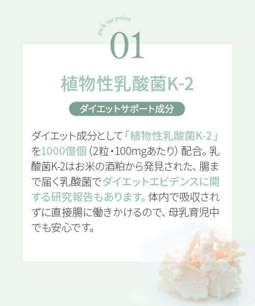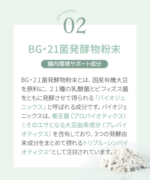 | 原材料 | 植物性乳酸菌粉末(植物性乳酸菌(殺菌)、デキストリン)(国内製造)、還元パラチノース、還元麦芽糖水あめ、ヨウ素含有酵母、加工油脂、セレン含有酵母、粉末油脂(中鎖脂肪酸油)、BG・21菌発酵物、モリブデン含有酵母、フルボ酸パウダー/セルロース、ビタミンC、グルコン酸亜鉛、ステアリン酸カルシウム、ピロリン酸鉄、CMC、グルコン酸銅、ナイアシン、乳化剤、ビタミンB2、ビタミンA、ビタミンB6、ビタミンB1、葉酸、ビタミンB12(一部に乳成分・大豆を含む) |